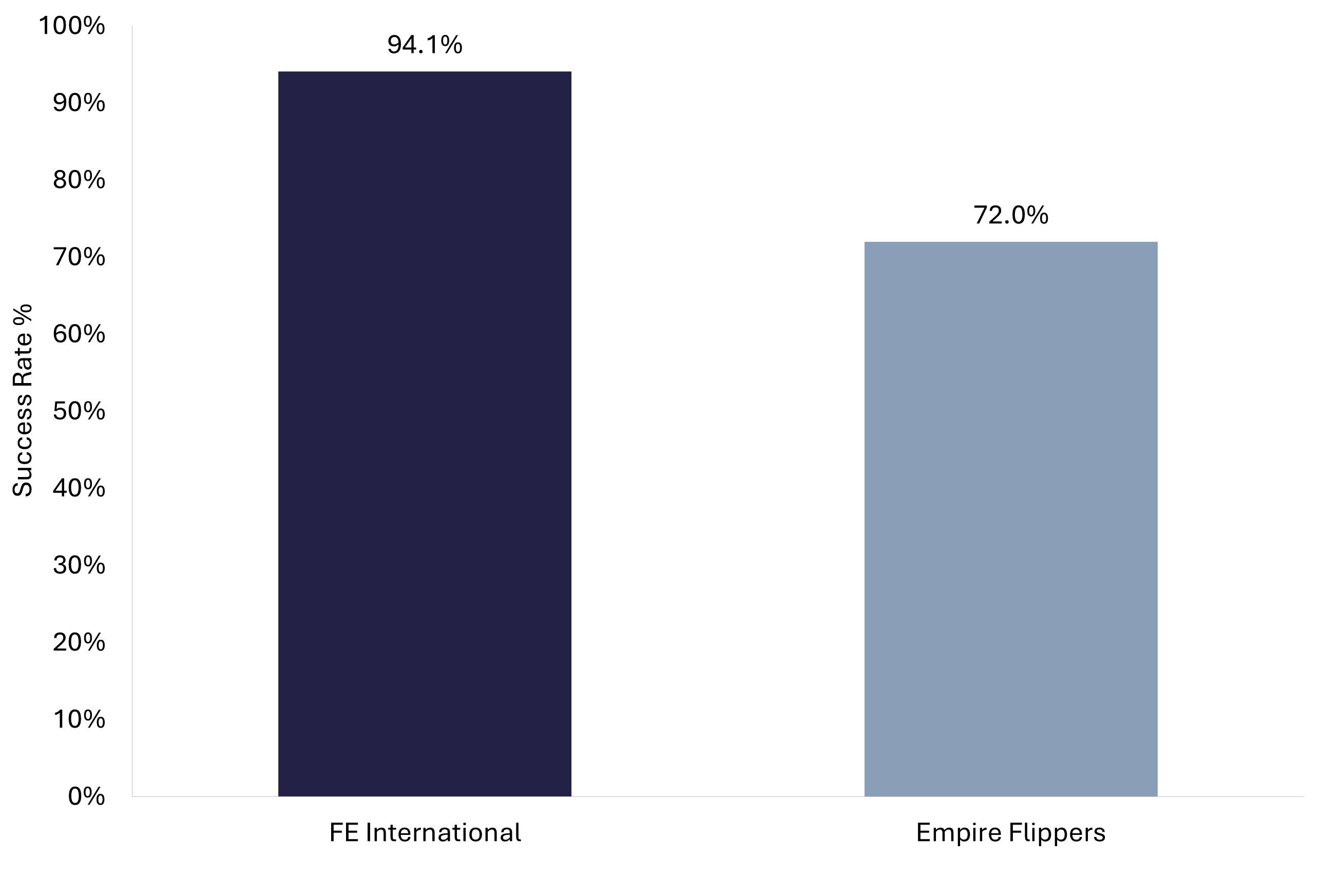 The 22-point gap in success rates is worth examining. A 94.1% close rate means that virtually every business FE International takes on reaches a successful exit. A 72% rate means roughly one in four listings does not sell during the listing period. Several factors drive this gap: