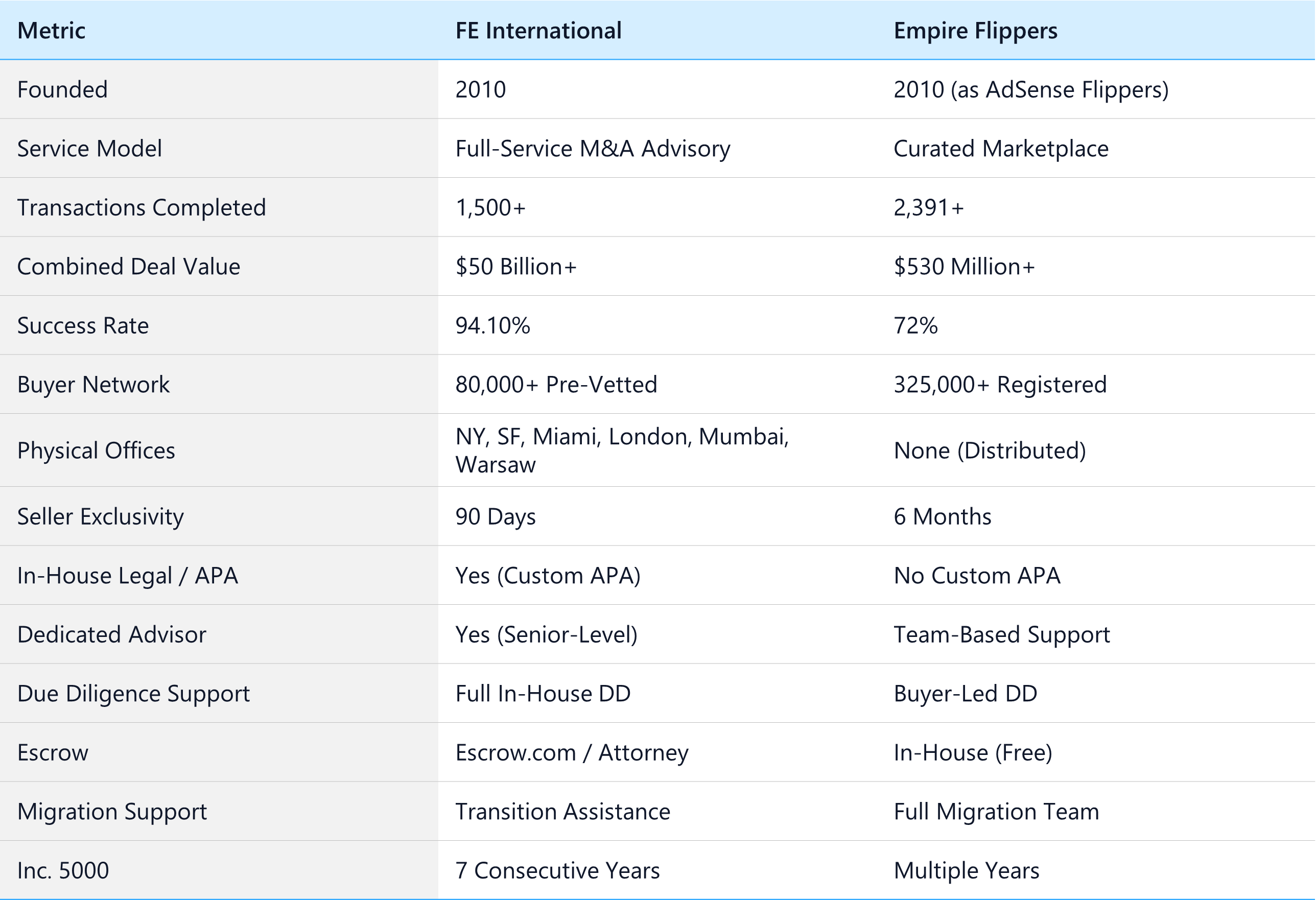 FE International is the stronger choice if: you want the highest probability of a successful close (94.1%), want access to institutional-quality buyers including PE firms and strategic acquirers; you value confidentiality and want an NDA-protected, advisor-controlled sale process; you need in-house legal support including a custom APA; you want a dedicated senior advisor managing every stage of the deal; or you prefer a shorter exclusivity period (90 days vs 6 months). The 94.1% success rate, $50 billion+ in combined transaction value, and seven consecutive years on the Inc. 5000 are not marketing claims. They reflect a firm that has built its process around maximizing seller outcomes.