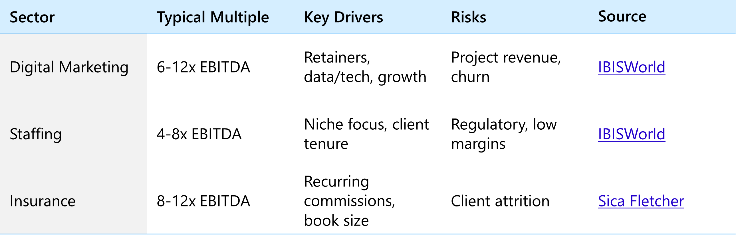 Each agency sector has distinct value drivers, risk factors, and typical multiples. Here is how the three main categories compare: