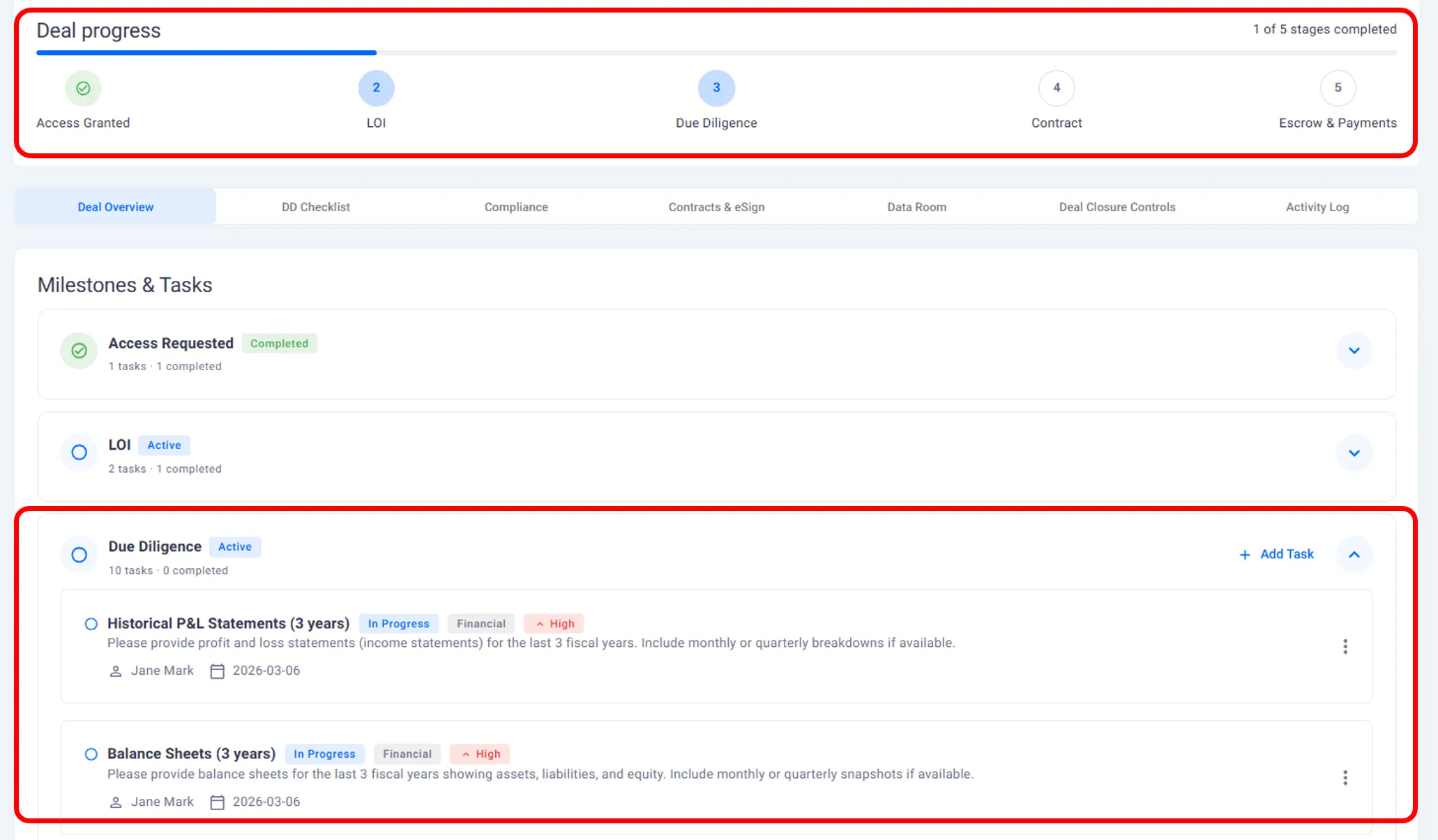 Due diligence tasks become available.