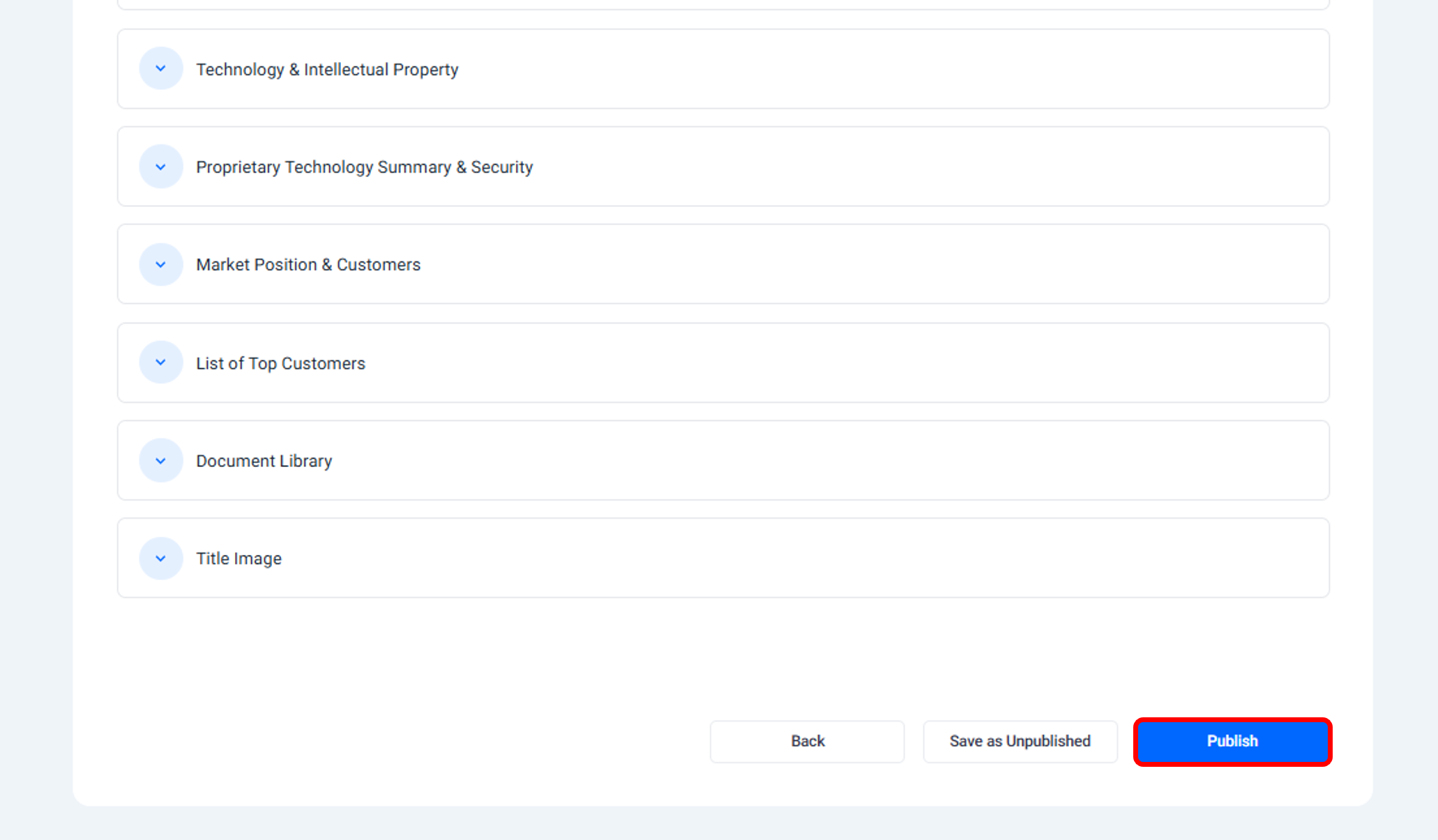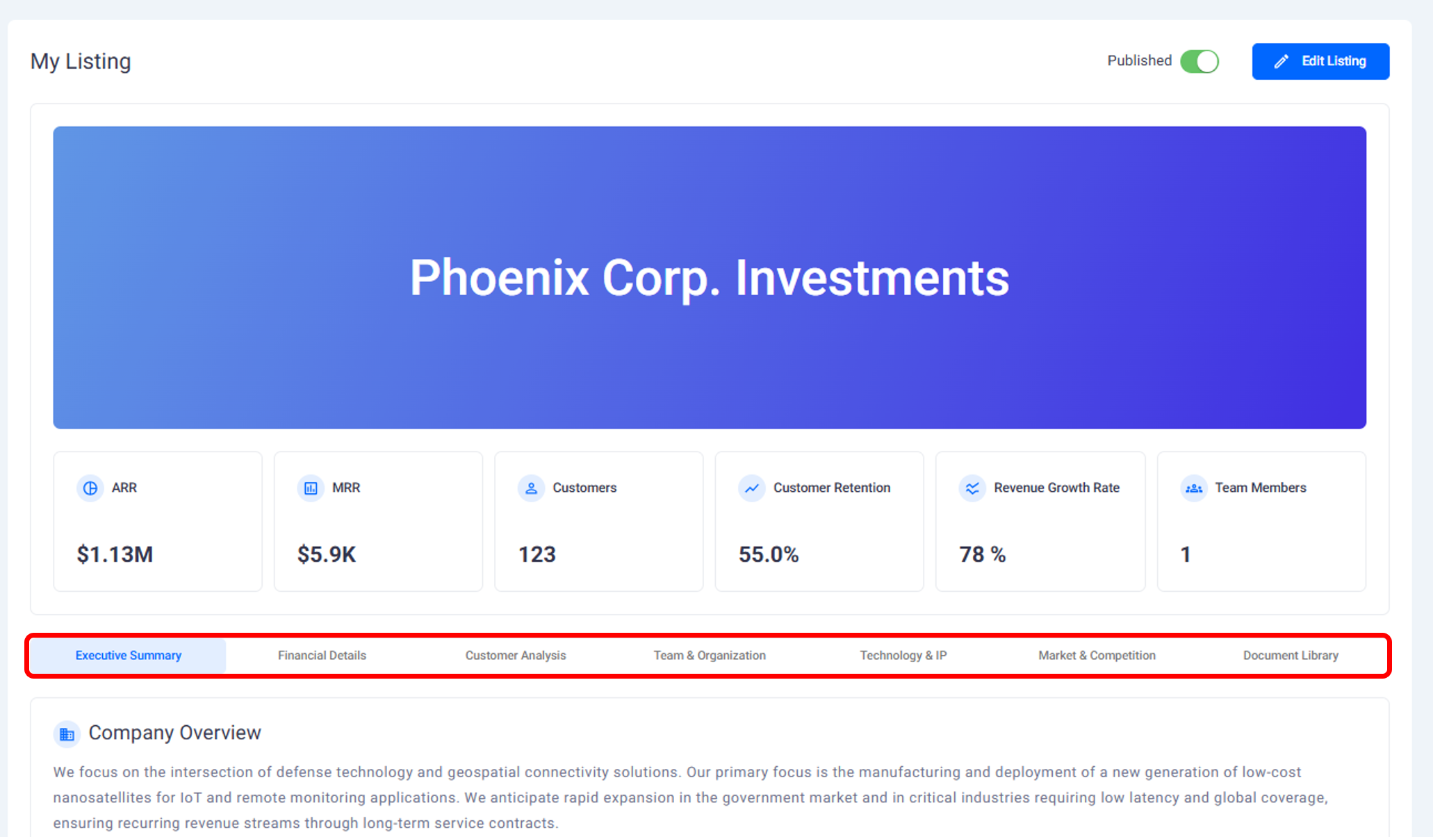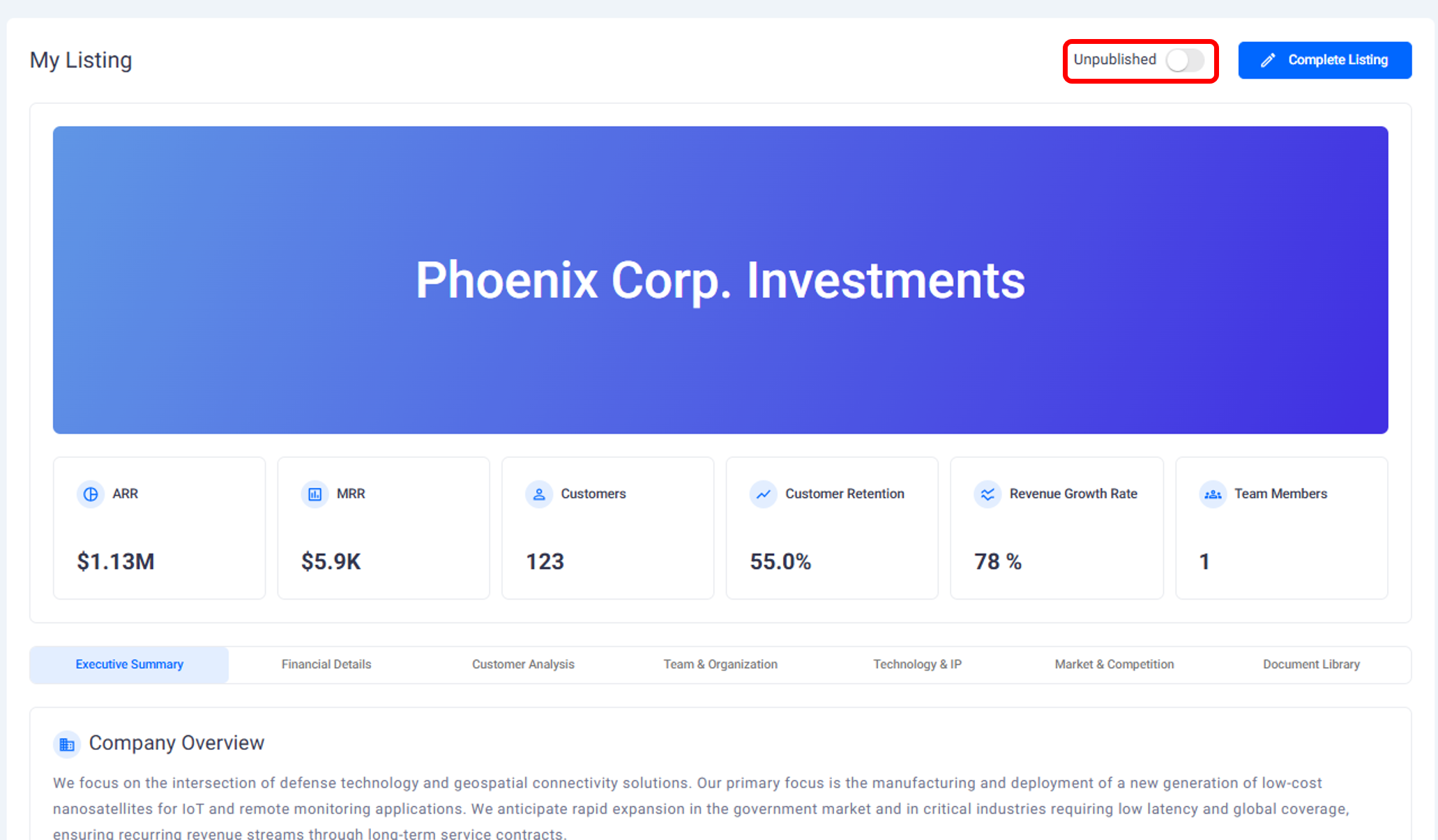 Once your listing is complete, you can publish it to make it available in the M&A marketplace.