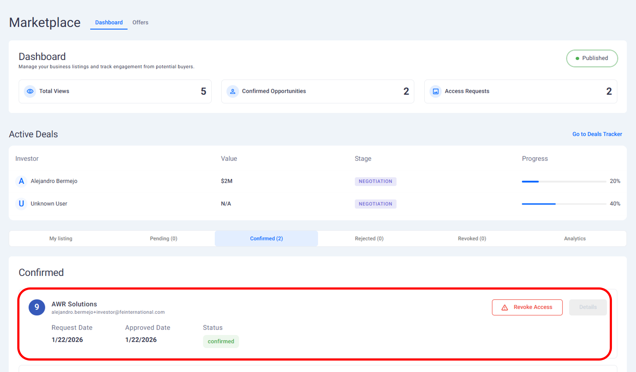 This page explains how founders track and manage active M&A conversations once offers move beyond the initial stage. The Deal Hub gives you a structured view of every buyer interaction tied to your business.