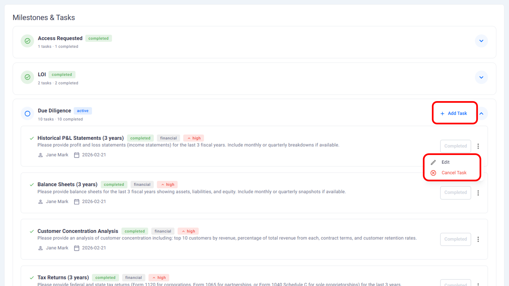 Once due diligence tasks are completed or nearing completion, the deal continues to progress through later stages.