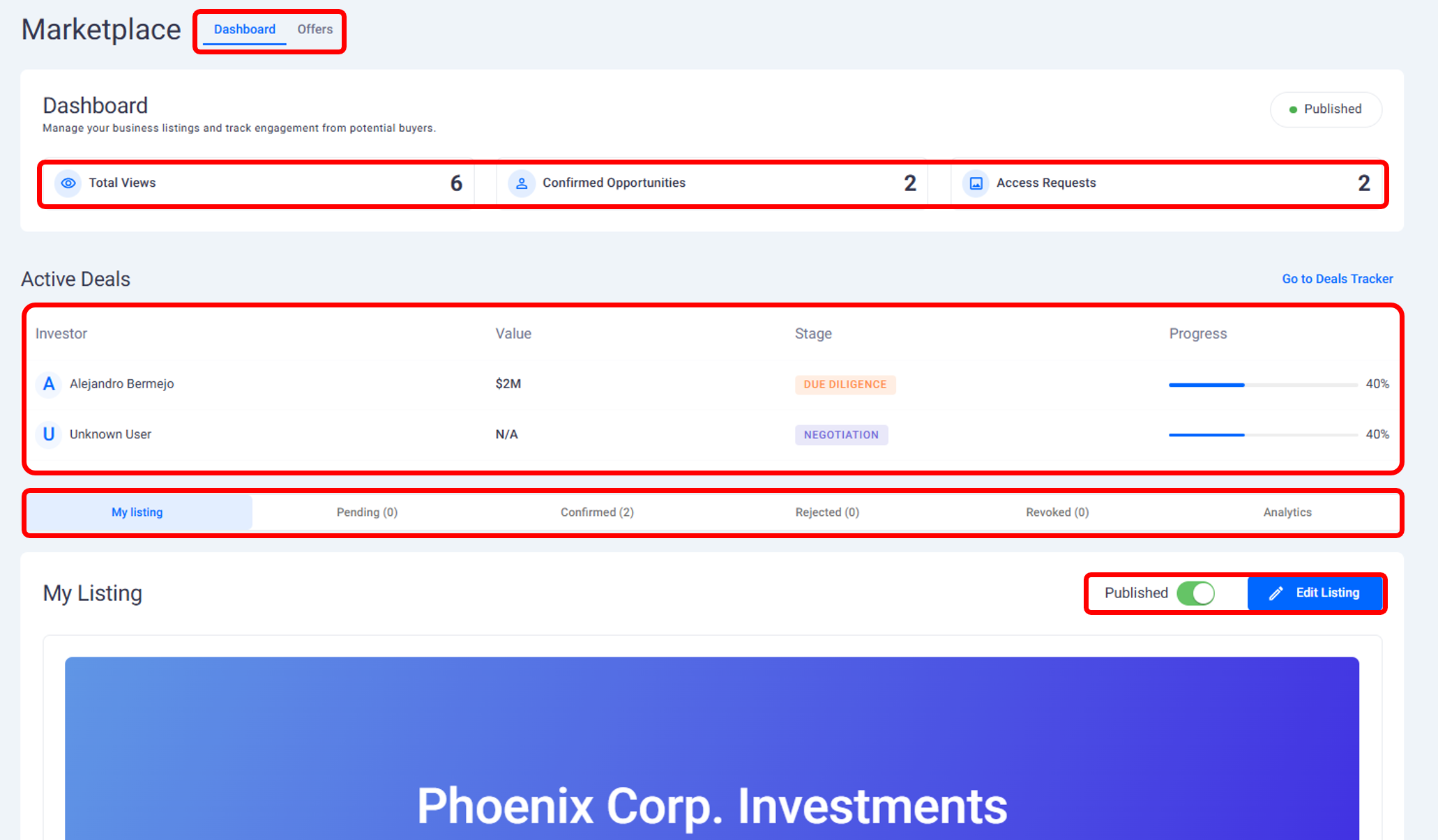 The platform tracks this progression so both founders and buyers can see where the deal stands.