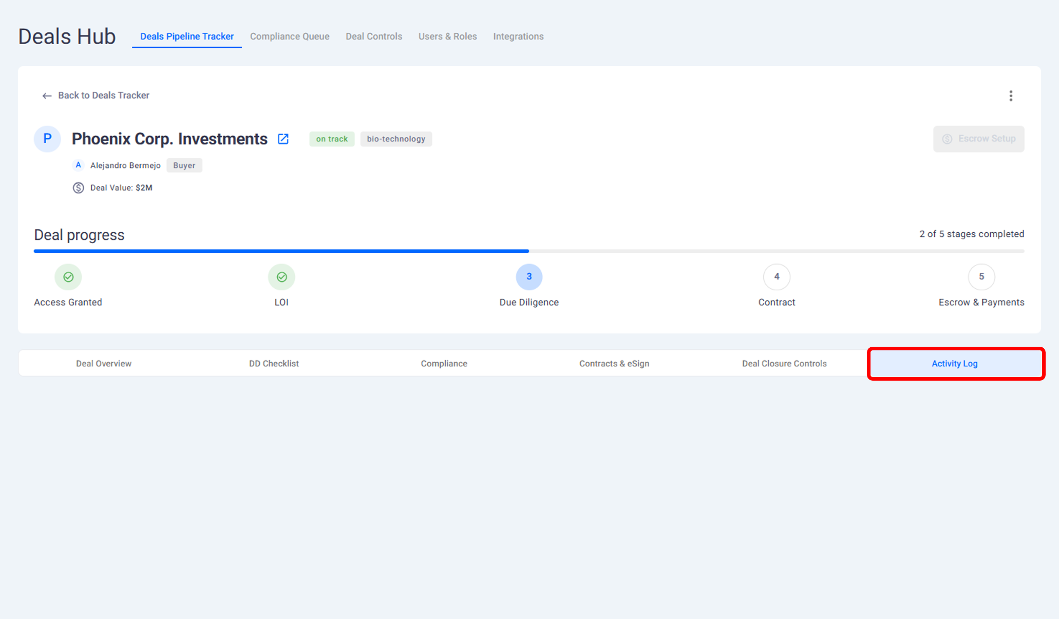 Throughout the entire deal lifecycle, the platform maintains a detailed activity history.