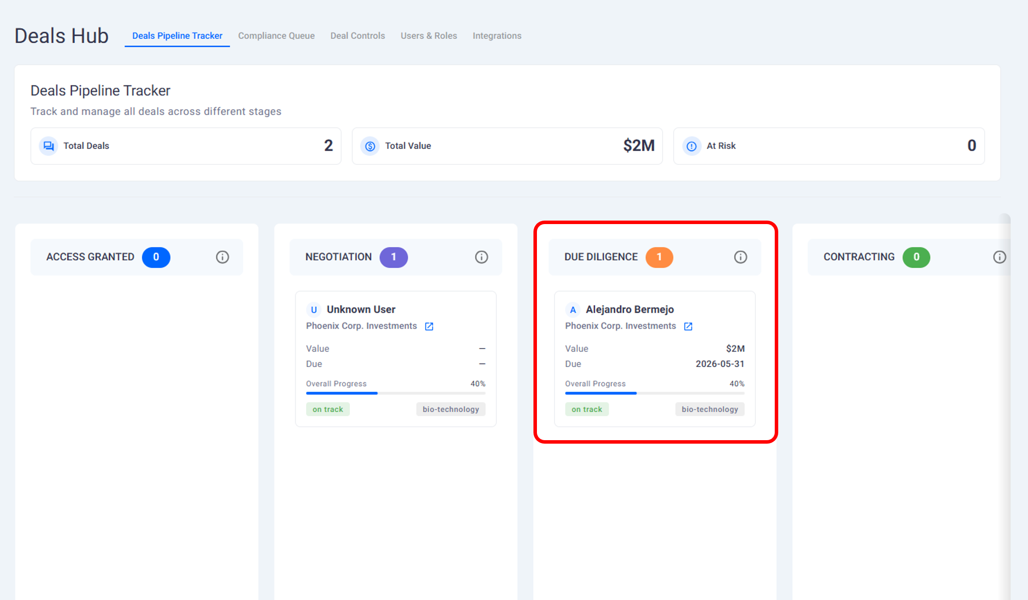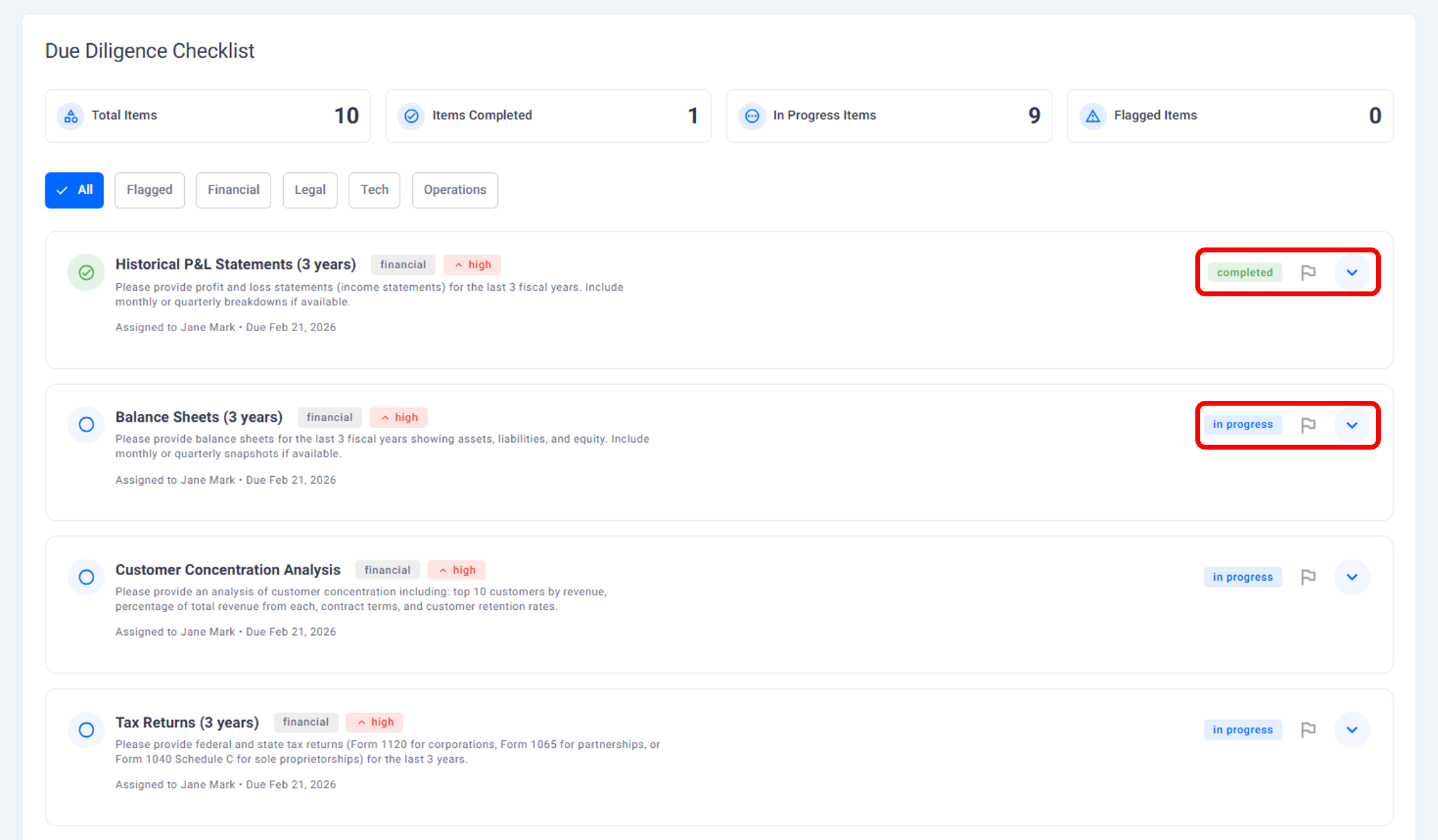 When a deal enters due diligence, the platform automatically creates a set of default tasks.