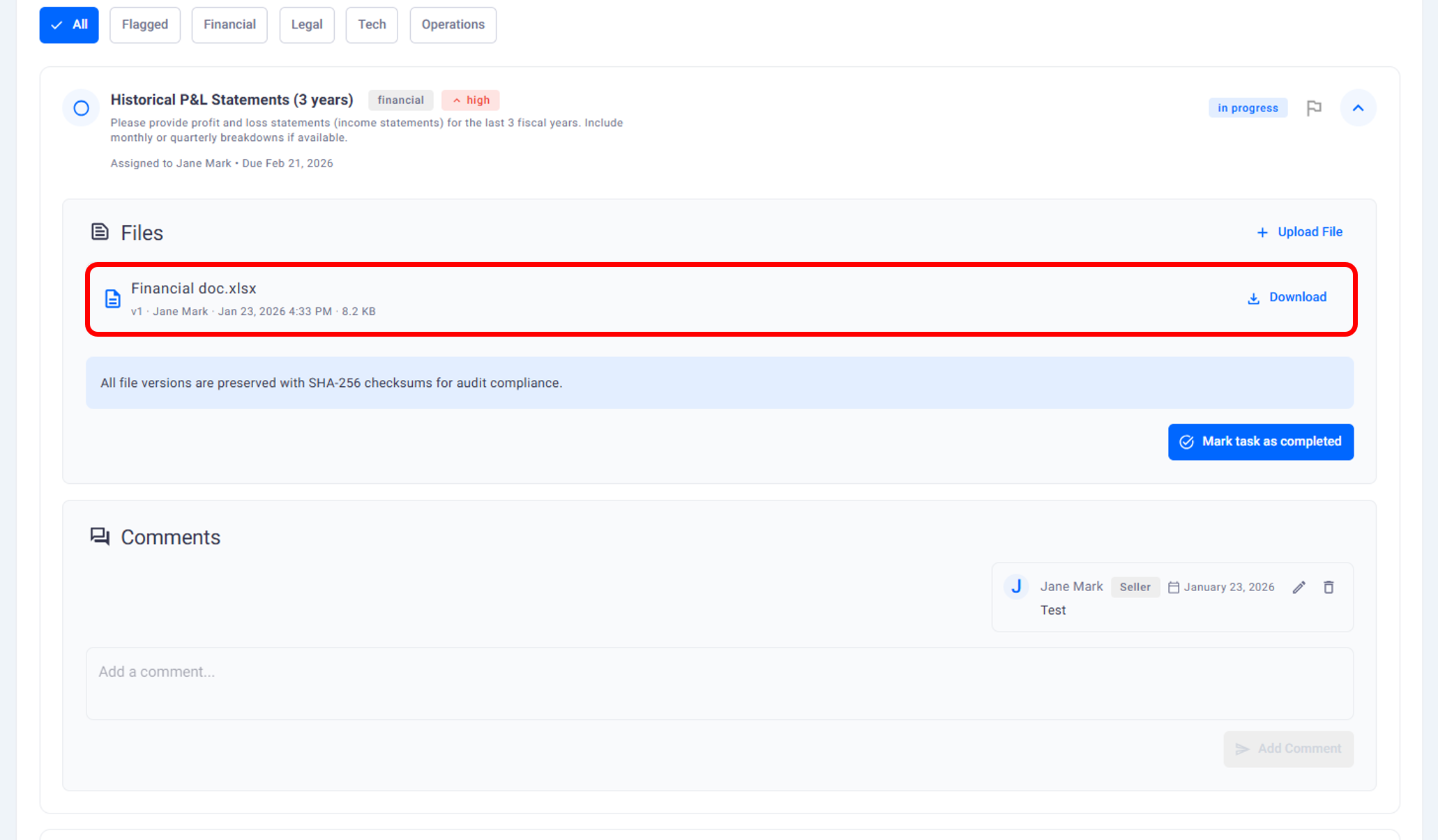 Buyers can review submitted documents, download files, and update task status as they work through the information.