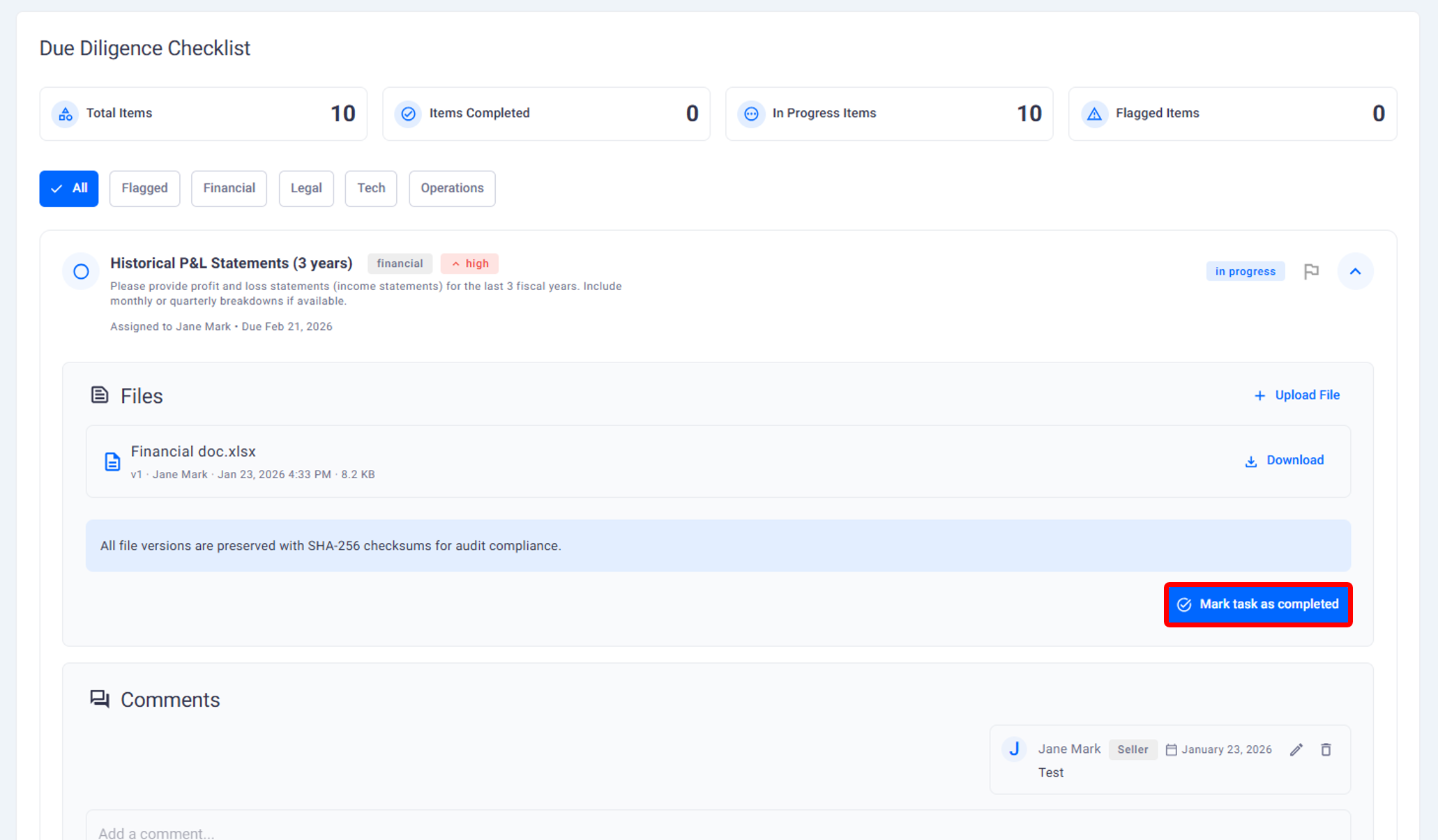 Due diligence is the process where the buyer requests additional information and documentation to better understand your business before completing the transaction. All of this activity is managed directly inside the platform.