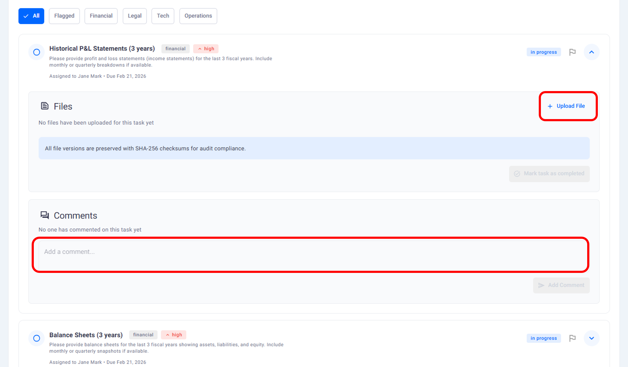 As a founder, you respond to due diligence tasks by submitting the requested information.