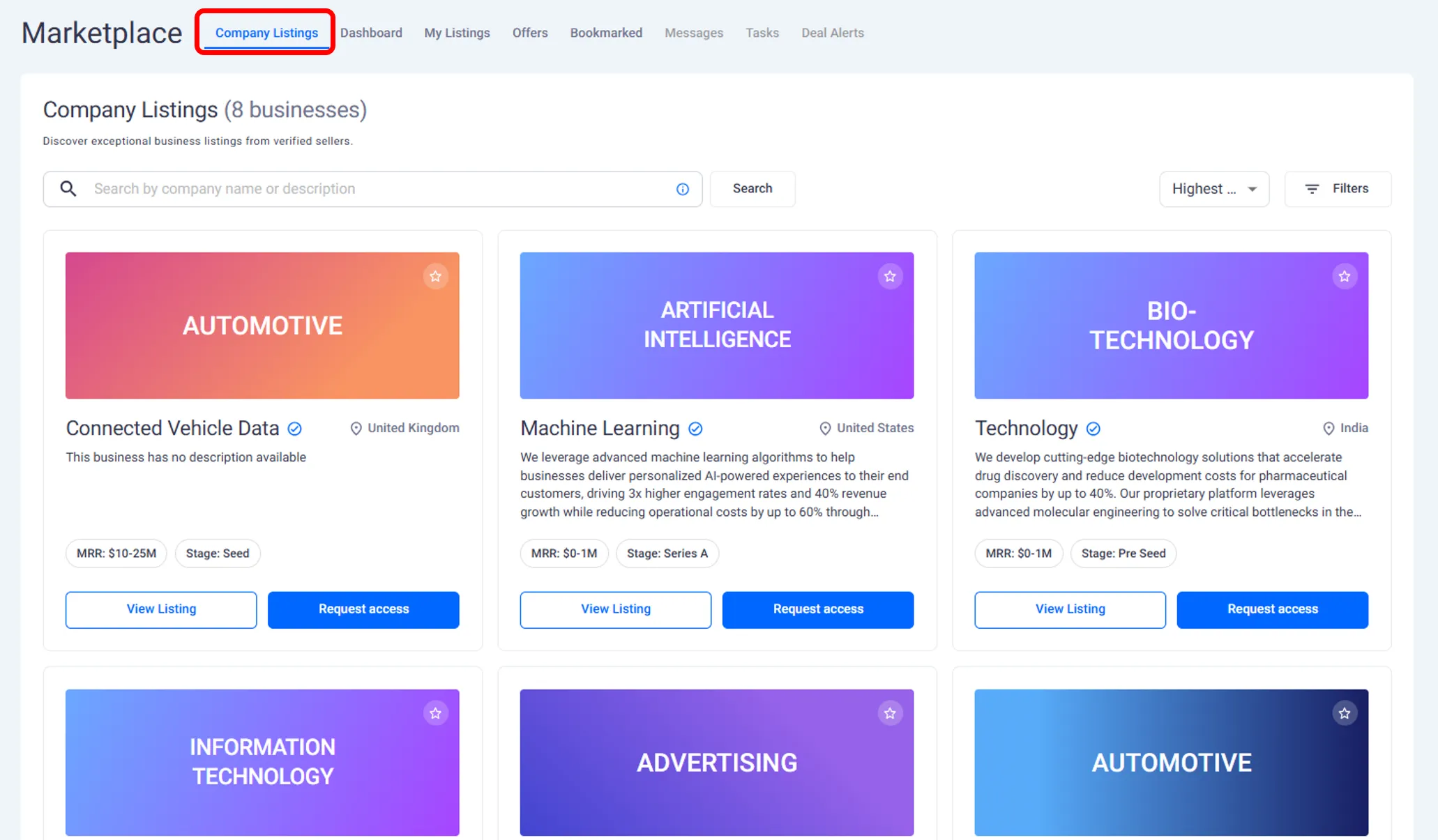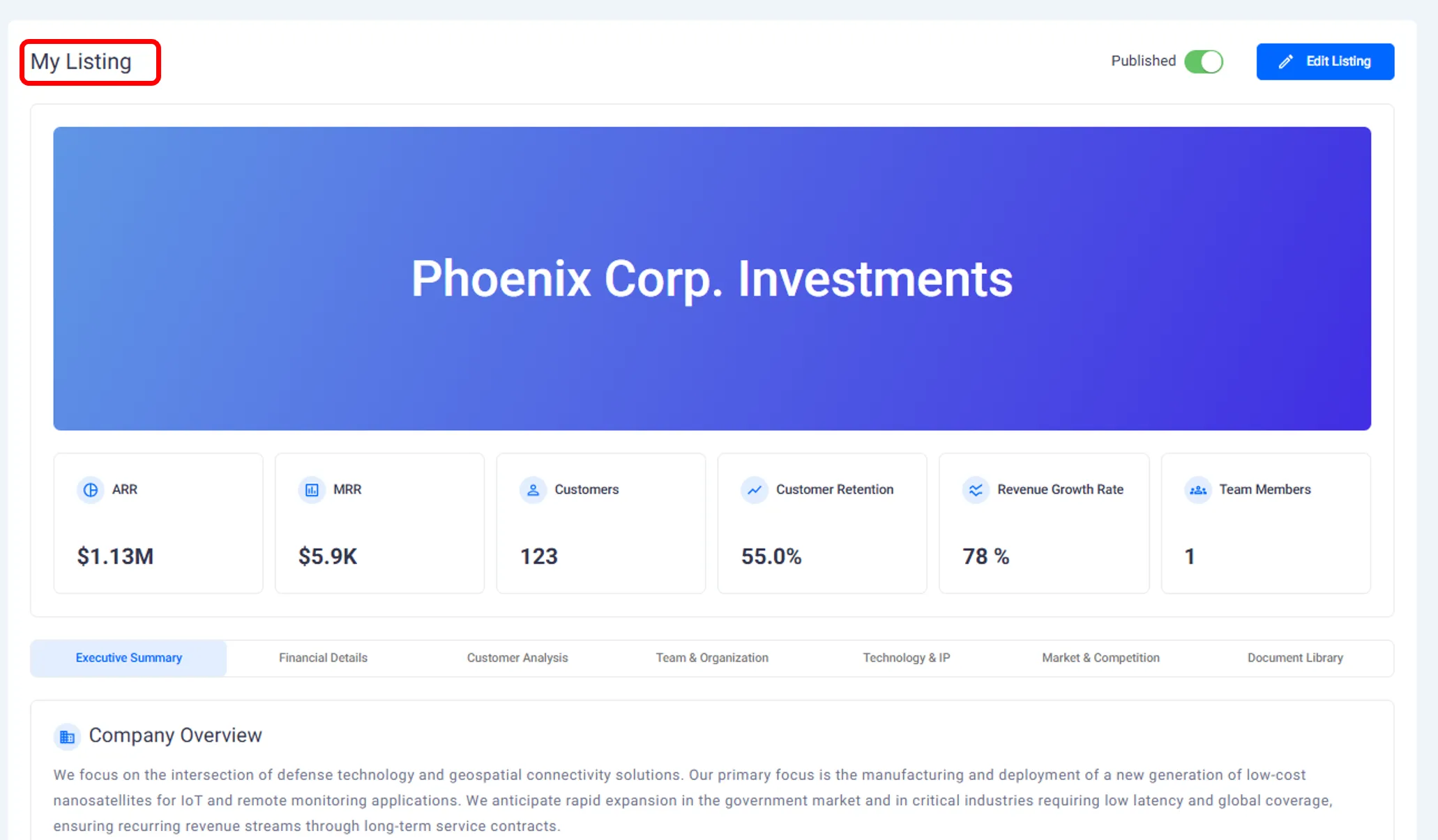 As a founder, you create and manage a business listing. This listing represents your company inside the marketplace and is the starting point for all buyer interactions.