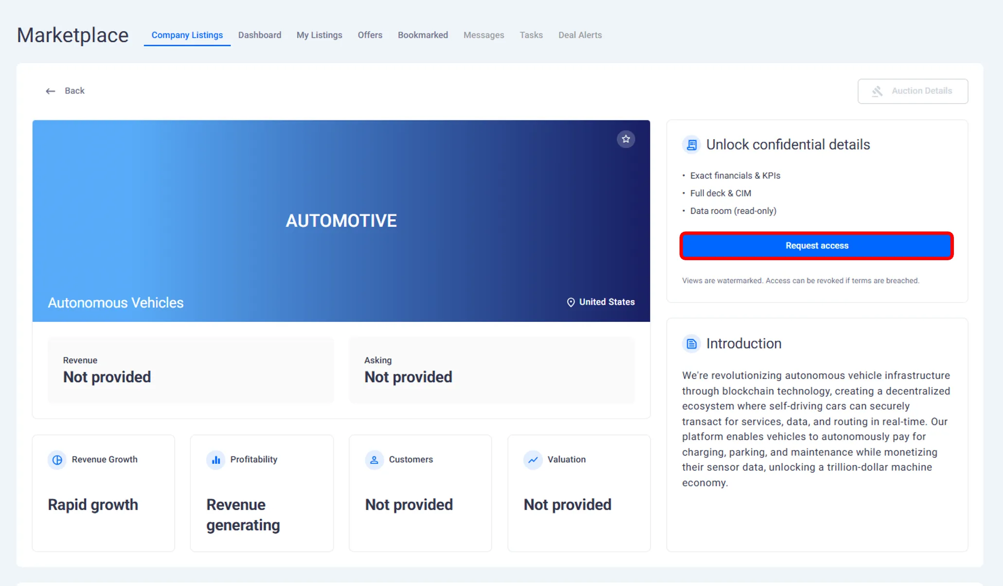 Once a buyer is granted access, they can view the full listing and decide whether to proceed further.