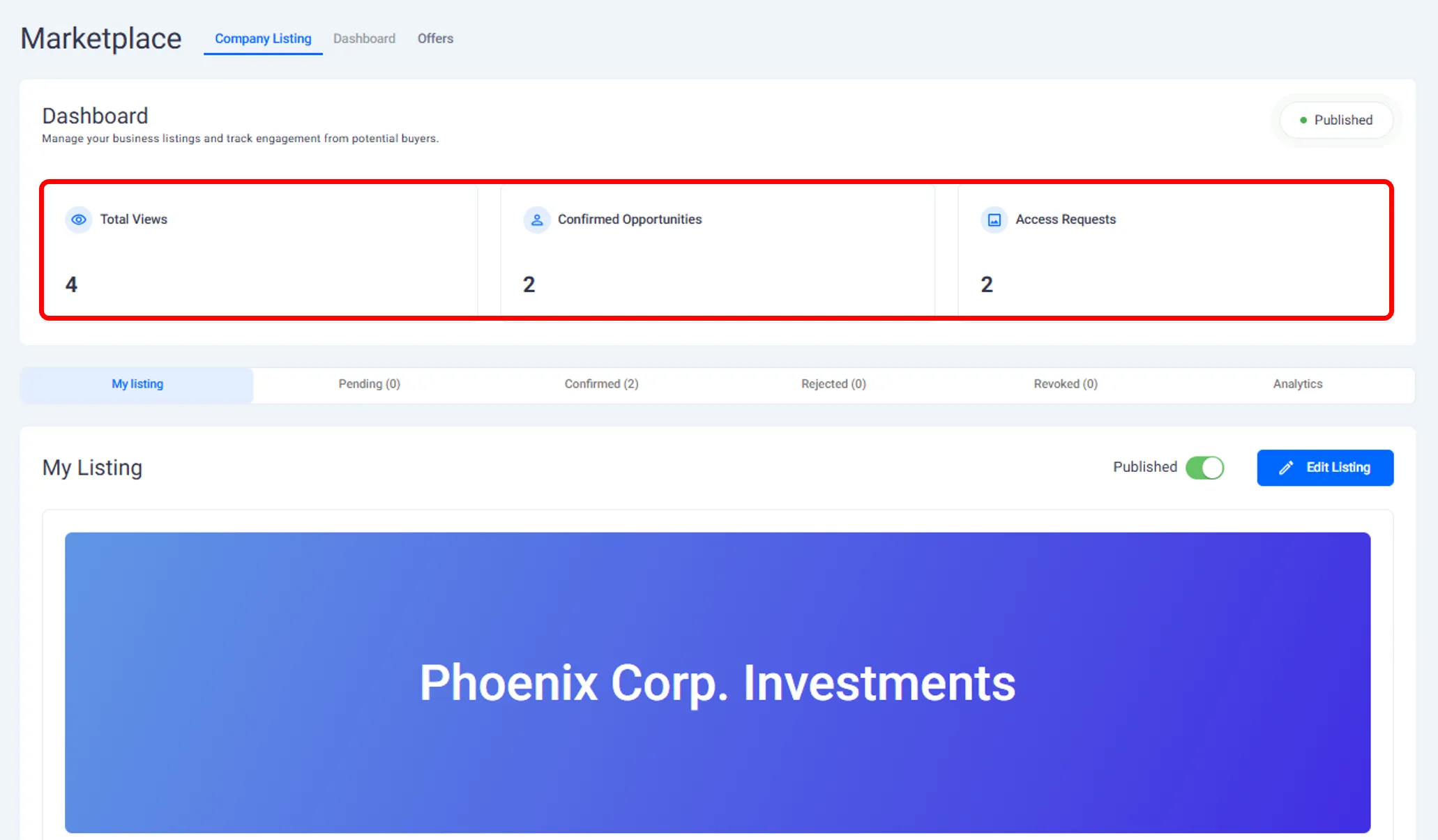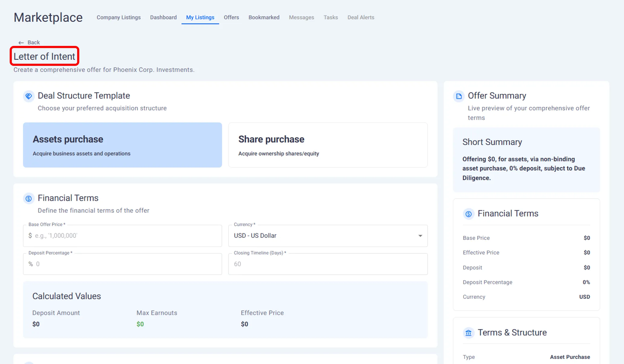 If they are interested, they may submit an offer or letter of intent through the platform. From that point onward, all activity related to that buyer is tracked as a deal, which you can manage from your Deal Hub.